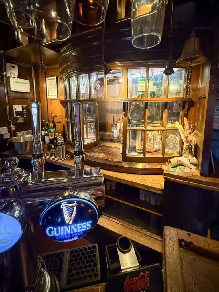 Once inside, you’re greeted with low-beamed ceilings, wooden pews, stone floors, and a bar that looks like it’s been propping up punters since Shakespeare was in nappies. The whole place is a delightful blend of the historic and the happily boozy.